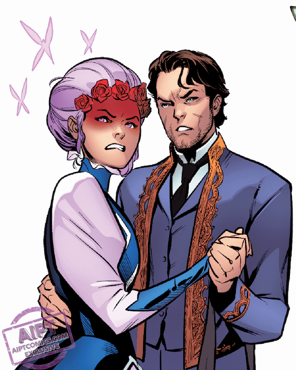 Spoilers: As Excalibur attend the Hellfire Gala, Rictor is not in the mood for celebrations. Shatterstar surprises Rictor, but the reunion doesn’t go quite as planned. After a while, Rogue is chosen as a member of the new X-Men. Rogue is congratulated by her teammates and thanks Excalibur for their time together. Gambit assures Betsy he’s not leaving Excalibur. Betsy and Jubilee try to comfort Rictor, who’s drowning his sorrows, but they are interrupted by Pete Wisdom. Wisdom asks Betsy to a dance and lets her read his mind. Betsy learns that while she was gone Coven Akkaba took the opportunity to encourage the British people to distrust Captain Britain and dismiss her as a pretender who abandoned them. Wisdom informs that Brousseau is now Britain’s ambassador to the U.N., which makes him Wisdom’s superior. Betsy realizes the High Priest Reuben Brousseau is in attendance and rushes to him. Brousseau formally notifies Xavier and Emma Frost that Britain’s alliance with Krakoa is over, which means that mutants living in Britain will be subject to British law, that the Krakoan gates are no longer welcomed and that all mutant drugs will be returned. Brousseau warns Betsy that Otherworld is not her land as King Arthur is the rightful ruler and that Britain won’t tolerate Excalibur controlling the Lighthouse on British soil. Rictor leaves the Gala outraged by the new developments. Elsewhere, Brian and Meggan small talk at the Gala. When Brian leaves, Nightcrawler takes the chance to flirt a bit with Meggan, and implies that she’s pregnant again. Meggan neither denies or confirms. At the balcony, Betsy is by herself lost in her thoughts when Rachel asks her to a dance. Rachel apologizes for not realizing Malice was possessing her, and Betsy asks her to visit the lighthouse more often. Brousseau leaves the gala and heads back to Coven Akkaba’s meeting house with Wisdom by his side. Brousseau reveals that Coven Akkaba plans to free Morgan le Fay from Jamie’s control. To that end, they ambush Wisdom and murder him, using his blood to channel magic and finally freeing Morgan. Elsewhere, Rictor heads back to the Lighthouse and summons his druids. With their help, Rictor is able to detach a piece of land from Cornwall’s coast and create a small island known as Braddock Isle, with Braddock Lighthouse at its very center. At the same time, Morgan is able to cross the Krakoan gate from Avalon to the Lighthouse. Rictor notices something’s off but is interrupted by Shatterstar again. The former lovers reconcile and reunite.